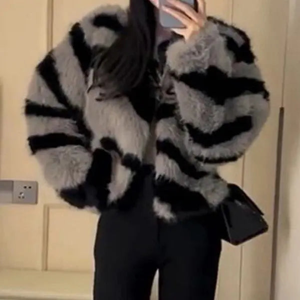 FZ Women's Zebra Pattern Faux Fur Short Classic Plush Jacket