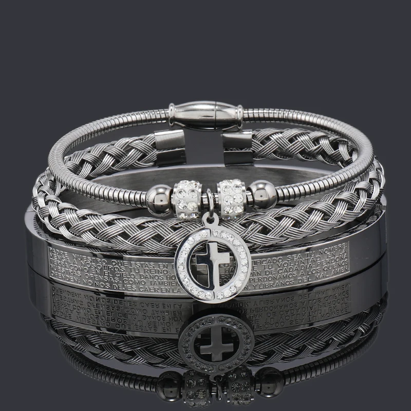 FZ Luxury Cross Open Carving Spanish Scripture Stainless Steel Bracelet Set