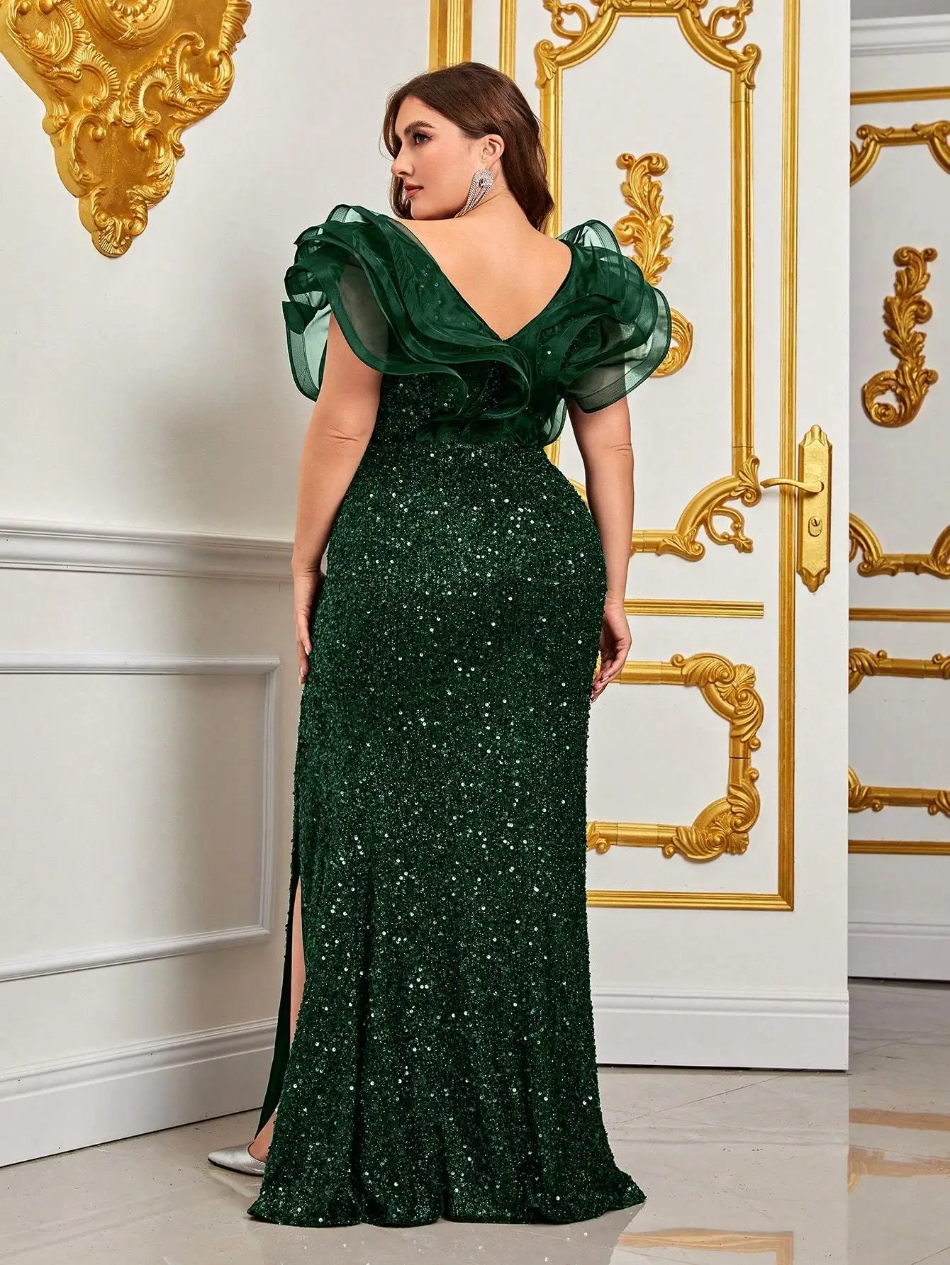 FZ Women's Plus Size V-neck Tiered Sleeve Sexy Slit Evening Dress
