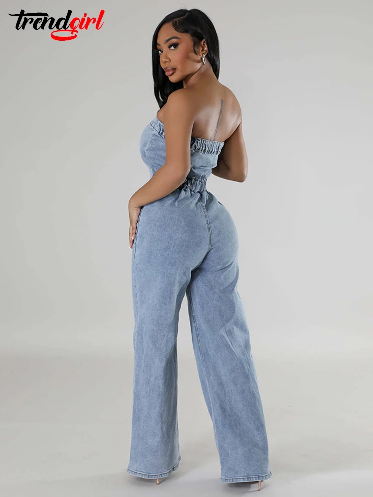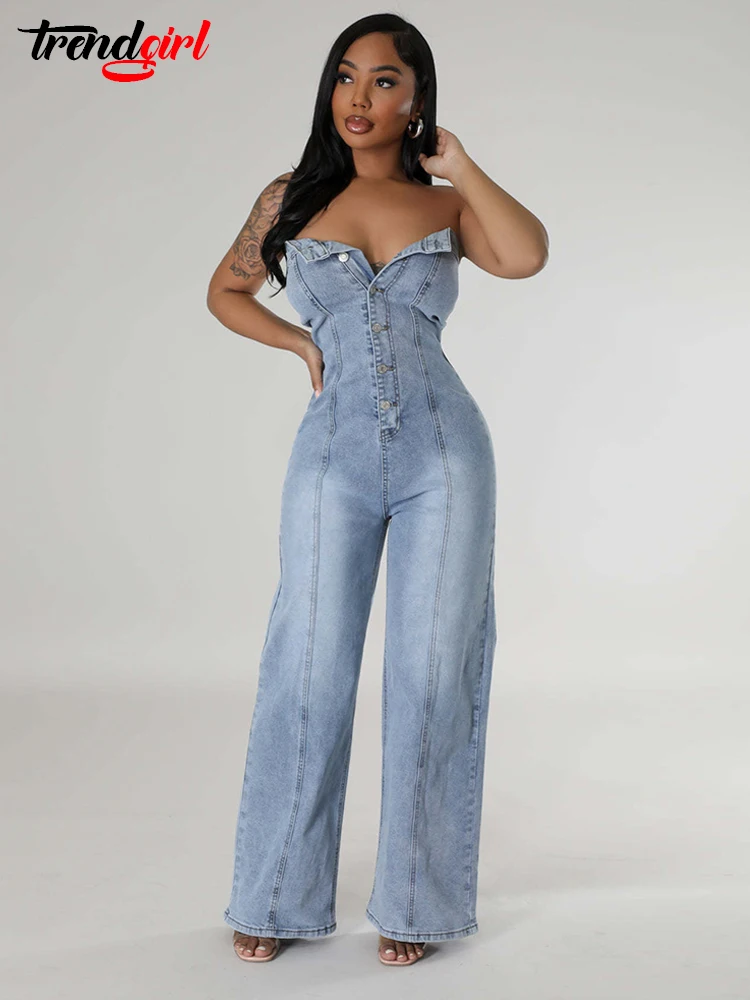 Trendgirl Off Shoulder Tube Top Backless Denim Jumpsuits Women Blue Single Breasted Wide Leg One Pieces Romper Jean Overalls FZwear
