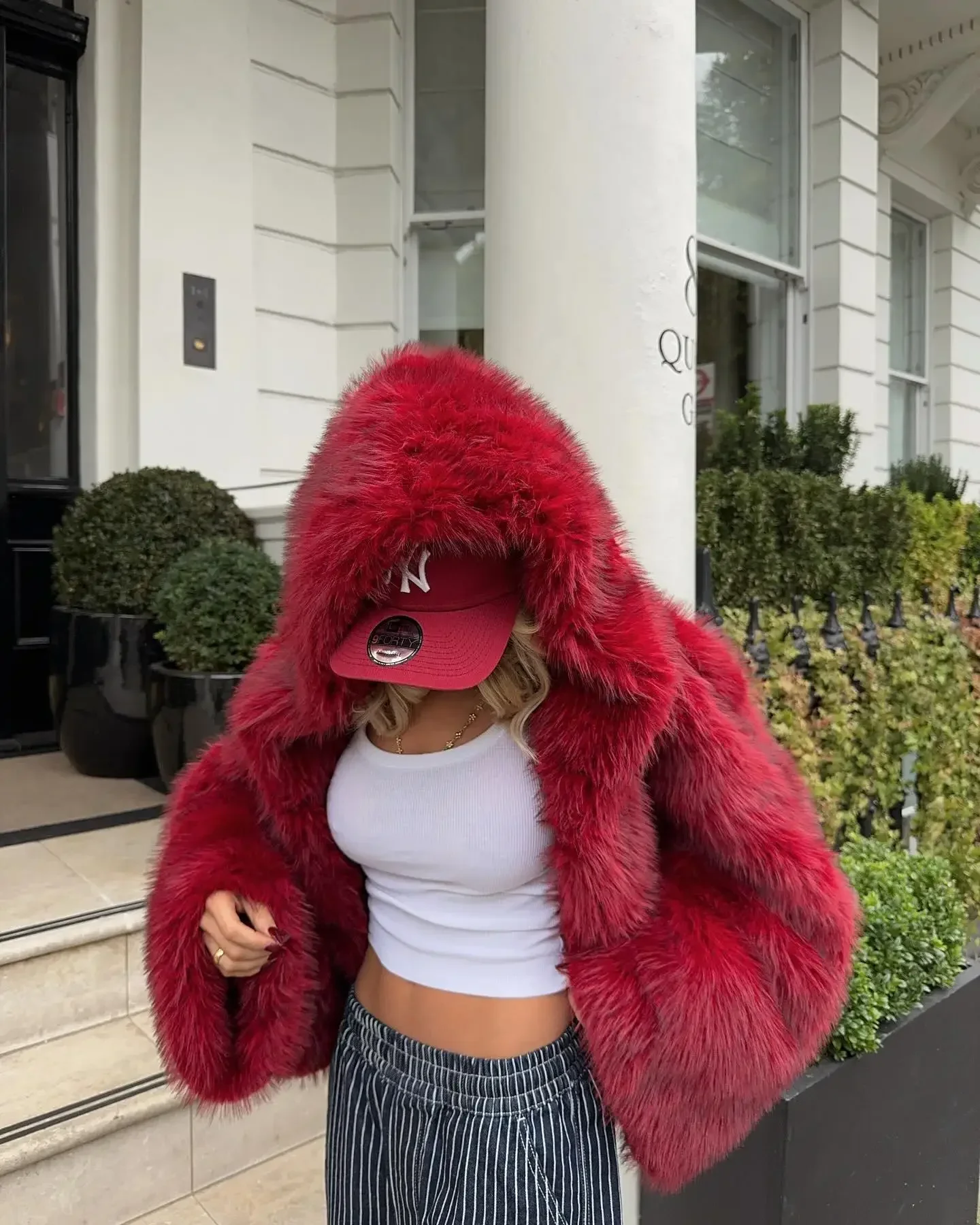 Experience a stylish and fashionable look with our FZ Women's Turn-down Collar Red Hooded Fluffy Faux Fur High Street Jacket.