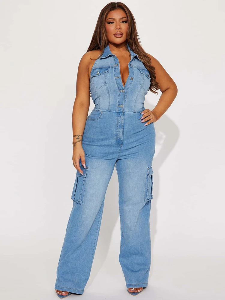Expertly crafted from stretchy denim, the FZ Women's One Piece Sexy Halter Denim Jumpsuit exudes both sexiness and fashion-forward style.