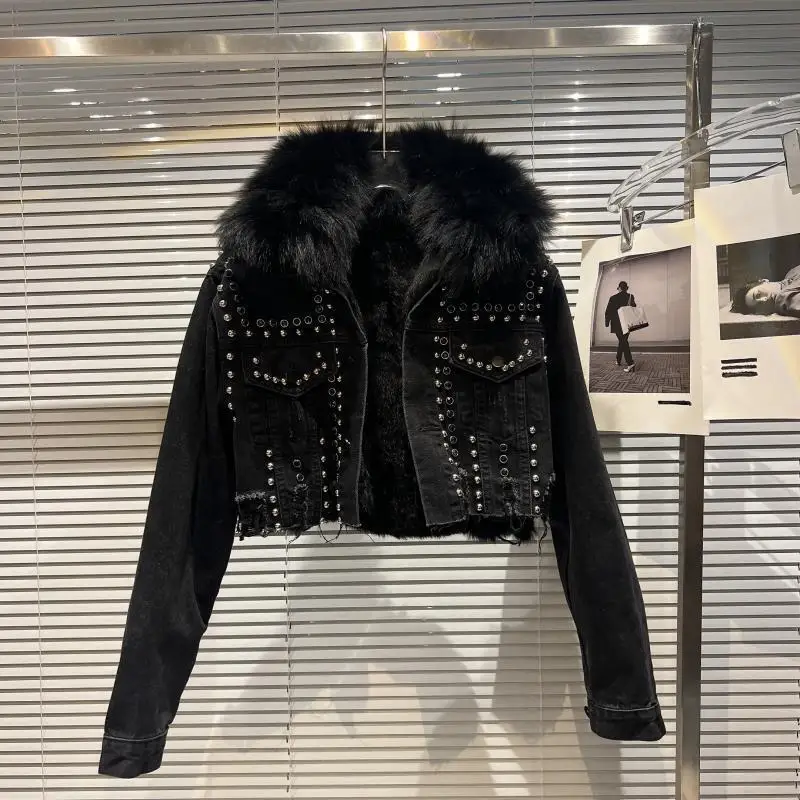 FZ Women's High Street Single-breasted Fox Fur Collar Rivet Liner Denim Jacket