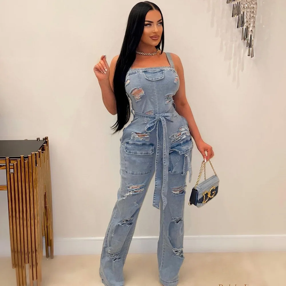 The sexy ripped details of this denim jumpsuit add an edgy touch to the classic denim material, while the wrapped chest and fringe accents provide a unique and stylish look. Elevate your wardrobe with this must-have jumpsuit.