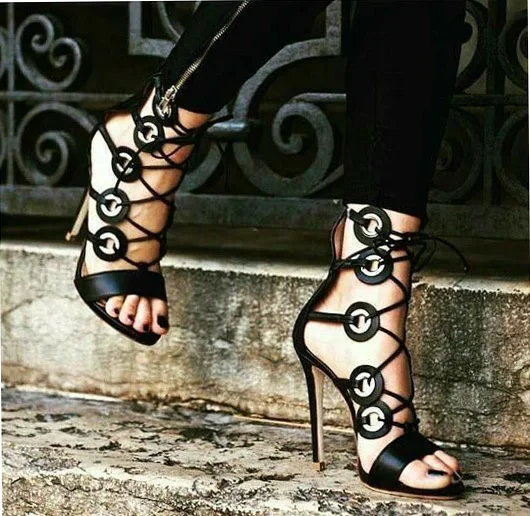 FZ Women's Cross Straps Metal Circle Lace Up Stiletto Open Toe Shoes