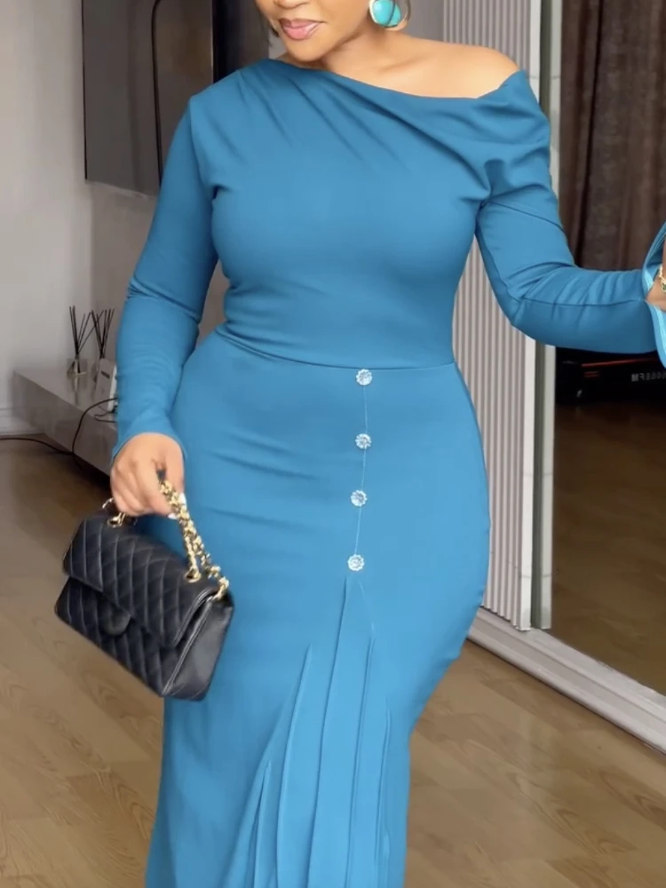 Featuring a sleek one-shoulder design and sophisticated front button detailing, this evening dress offers a flattering silhouette for formal occasions. The long sleeves add a refined touch, while the flowing maxi length ensures graceful movement. Perfect for evening events, this dress balances timeless charm with contemporary fashion.