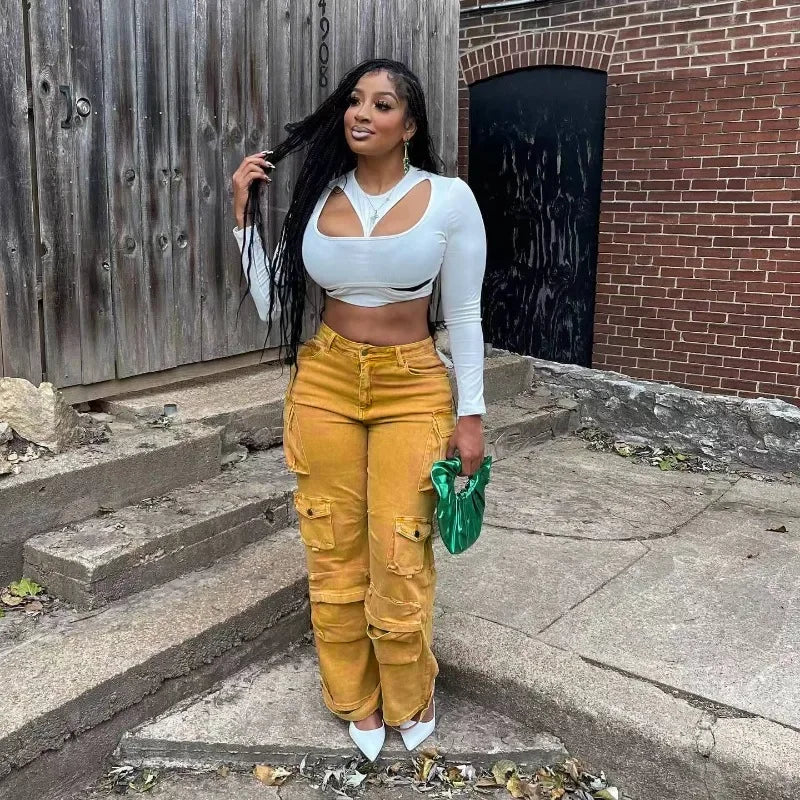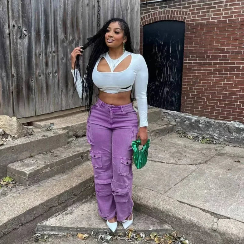 FZ Women's High Waist Loose Straight Denim Cargo Pants