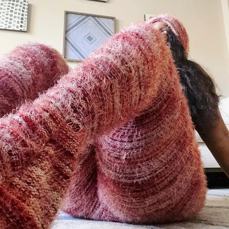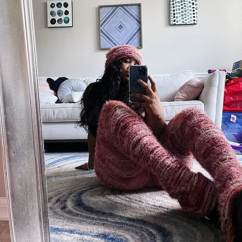 FZ Women's Elastic High Waist Slim Flare Striped Furry Knitted Stacked Pants