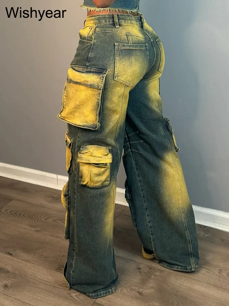 FZ Women's Retro Fashion Tie-dye Wide Leg Washed Mid Waist Denim Pants
