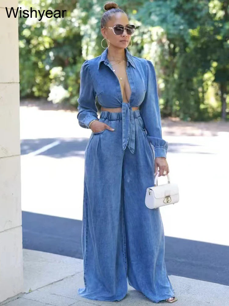 FZ Women's Set Long Sleeve Wide Leg Loose Streetwear 2 Pieces Denim Pants Suit