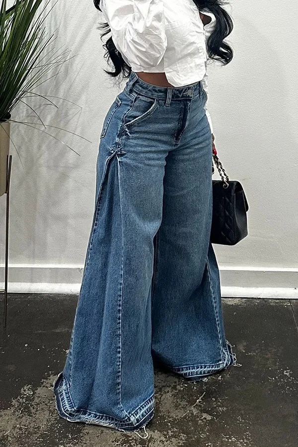 Elevate your wardrobe with FZ Women's Spliced Casual Trendy Loose Wide Leg Flare Denim Pants.