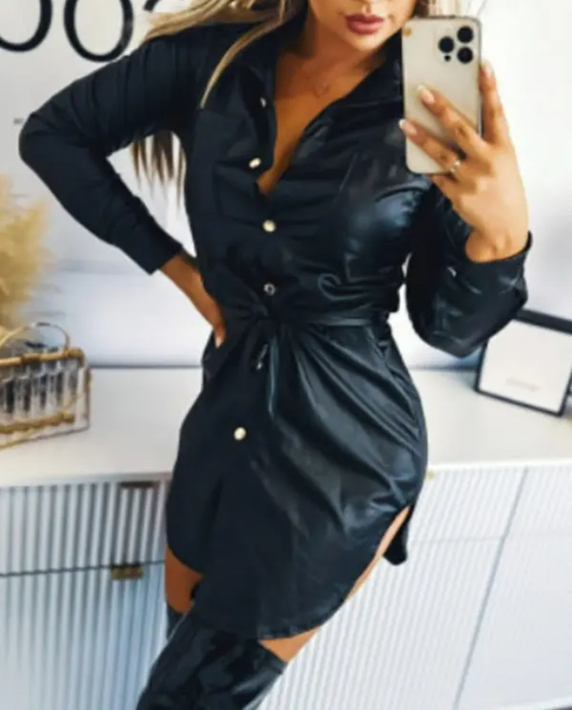FZ Women's Tied Detail Slit PU Leather Shirt Dress