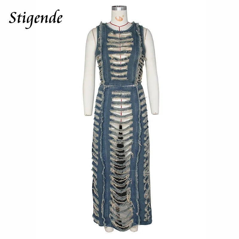 The ripped holes of this denim skirt suit add a touch of edginess, while the high split and hollow out design bring a sexy and alluring vibe. Perfect for those looking to make a statement with their fashion choices.